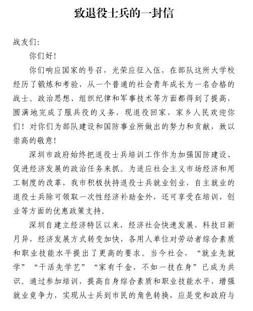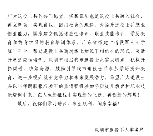近日,深圳市退役军人事务局发布《2025年秋季退役士兵教育培训指导手册》,2025 年秋季退役士兵教育培训政策重磅落地,其中无人机培训被列为重点扶持项目,是集“政策红利 + 行业风口” 于一身的最优解!当退伍号角吹响,你是否也曾站在人生十字路口迷茫:离开熟悉的军营,如何快速融入社会?没有专项技能,怎样找到稳定又有前景的工作?如果你正在寻找答案,那么今天这篇推文,就是为你准备的。(各级财政按规定予以保障,可从开展职业技能提升行动提取的失业保险基金中列支。)全程免费学:免学杂费、免住宿费、免技能鉴定费,3个月系统培训零成本投入;生活有保障:培训期间发放生活补贴,不用担心学习期间的经济压力;叠加福利多:如果后续创业,可申领1 万元初创补贴、最高 60 万元创业担保贷款,还能享受 3 年场租补贴(最高 1560 元 / 月);若入职企业,用人单位可获 1 万元补贴,你也能享受企业税收优惠带来的薪资倾斜。2. 怕学不会?定制课程 + 硬核师资,军人优势秒转化针对退役军人的学习特点,全球鹰量身打造课程体系,完全适配你的节奏:师资够专业:全球鹰无人机由10年经验技术专家授课,理论课全由具备职称教师主讲;实操占比高:模拟飞行+ 真机训练 + 紧急处置,从起飞悬停到复杂场景作业,手把手教你掌握核心技能,军人的专注力和执行力在这里直接变现;拿证有保障:培训后可考取CAAC 民用无人机操控员执照(全国通用),通过率稳居行业前列,持证就能竞聘上岗。3. 怕没前景?低空经济风口正劲,岗位缺口大到 “抢人”现在学无人机,相当于10 年前学互联网!深圳作为低空经济核心城市,无人机应用场景遍布各行各业:就业方向广:农林监测、电力巡检、影视航拍、应急救援、物流配送、环保监测,岗位覆盖政企、央企、创业公司;薪资待遇优:初级飞手月薪6000+,资深飞手或项目工程师月薪轻松过万,教员岗位更是高达 15000+;发展空间大:可转型无人机培训教员、创业成立服务公司,甚至参与政府低空经济项目研发,越干越吃香。培训资源顶级:全球鹰无人机官方认证机构,拥有10 万㎡标准版训练场、近万㎡室内实训场地,设备全是行业主流机型;政策衔接顺畅:报名可通过“深圳市退役军人就业创业服务系统” 一站式办理,区退役军人事务局全程指导,材料审核、补贴申请都有专人对接;战友抱团取暖:培训班级全是退役军人学员,熟悉的作息节奏、相同的奋斗目标,学习路上有人并肩作战,还能积累优质人脉资源。战友亲历:从迷茫退伍兵到无人机达人,我只用了3 个月“退伍后我一度不知道能干什么,直到看到深圳的无人机培训政策,果断报名!” 龙岗区退役军人李嘉书的经历,说出了很多战友的心声。培训期间,他凭着部队练就的坚韧毅力,白天反复练习飞行操作,晚上钻研理论知识,克服了技术陌生、操作失误等难题,顺利拿到CAAC 执照。现在的他,不仅成为了一名专业无人机飞手,负责电力巡检工作,月薪过万,还计划未来创业成立无人机服务公司,享受深圳的创业补贴政策。“退伍不是终点,而是新起点。学无人机让我重新找到了方向,军人的品质让我在学习和工作中少走了很多弯路,政策的支持更让我没有后顾之忧!”填写对应院校报名表(可在院校官网下载或现场领取);到所属区退役军人事务局审核盖章;携带材料到院校现场确认,等待开班(满额即开,早报名早占位)。